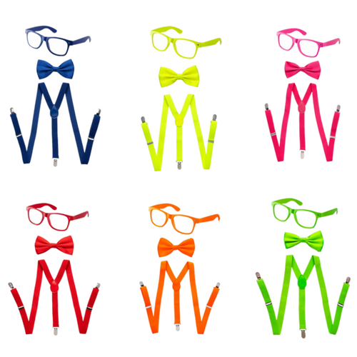 Adults/Teens Neon Suspender, Bowtie, & Glasses Accessory Set