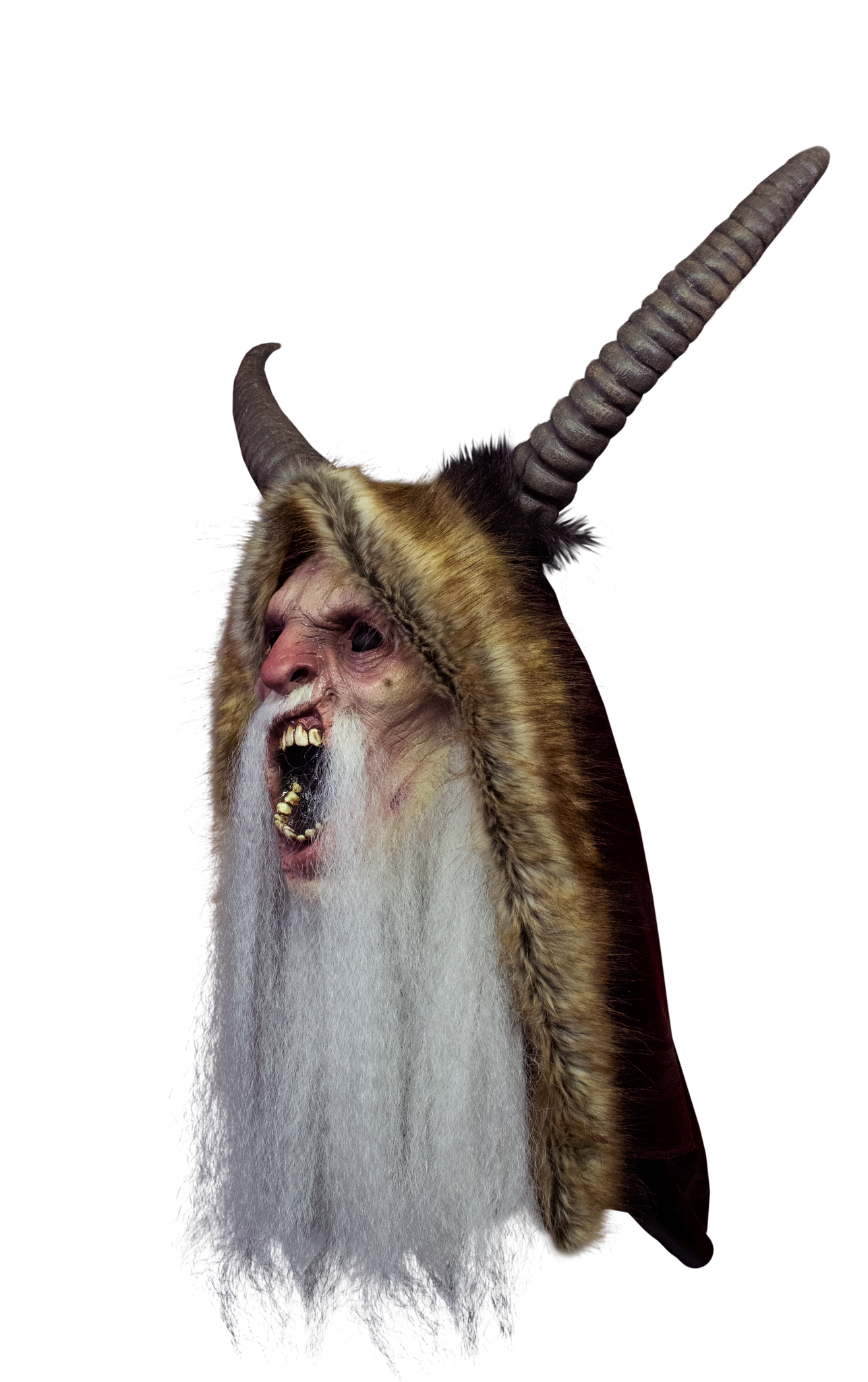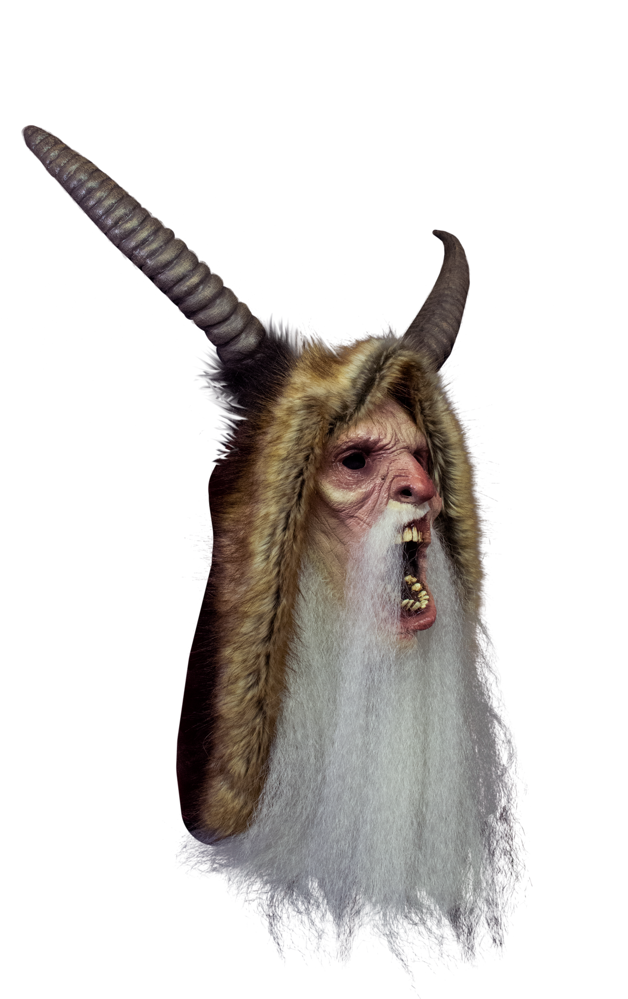 - Features growling Krampus face with long white bead, brown horns and soft hood