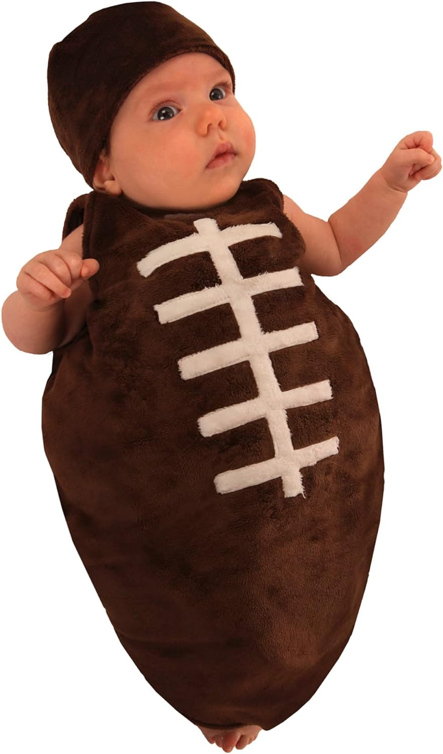 - Includes brown football shaped, sleeveless bunting, and matching brown cap