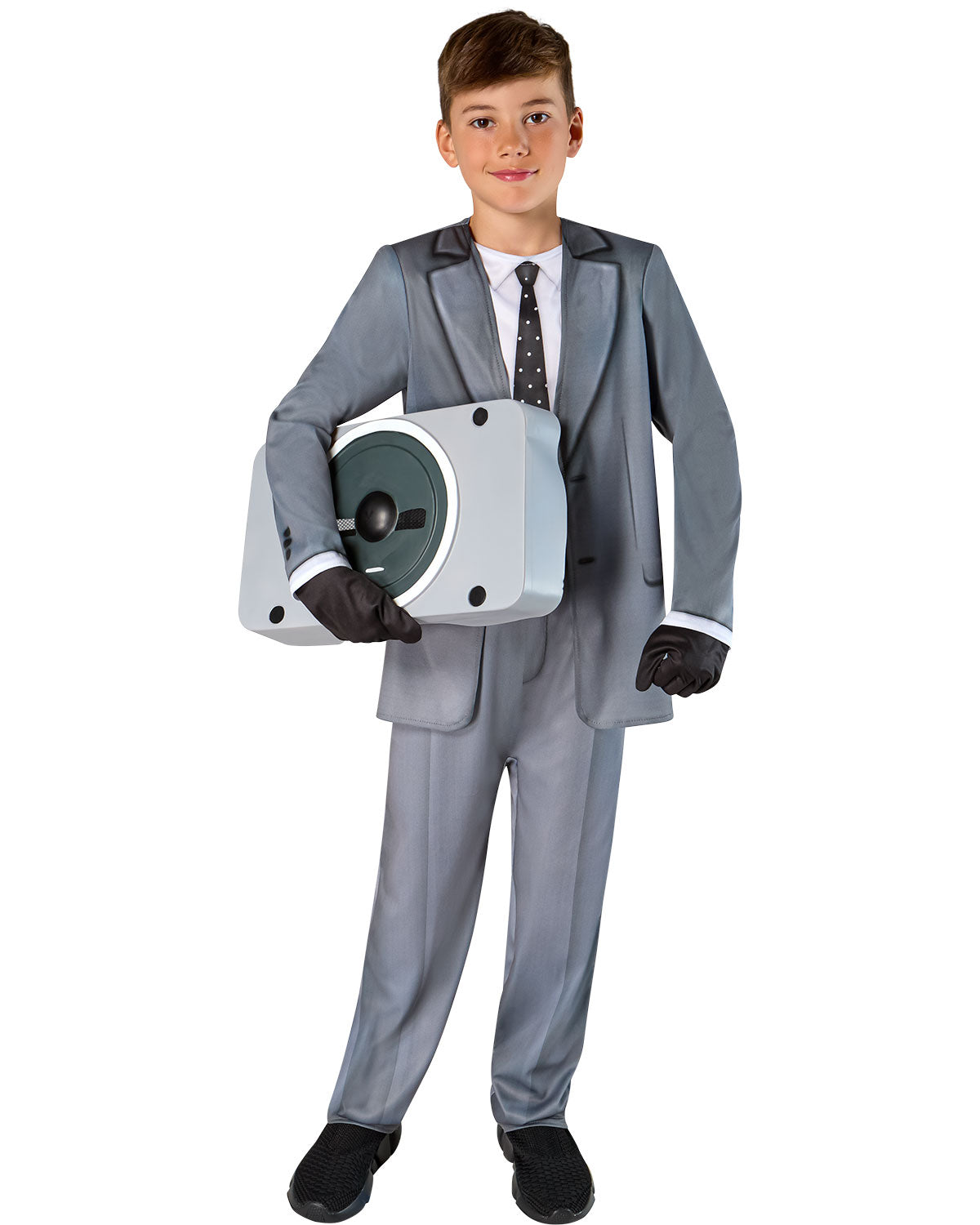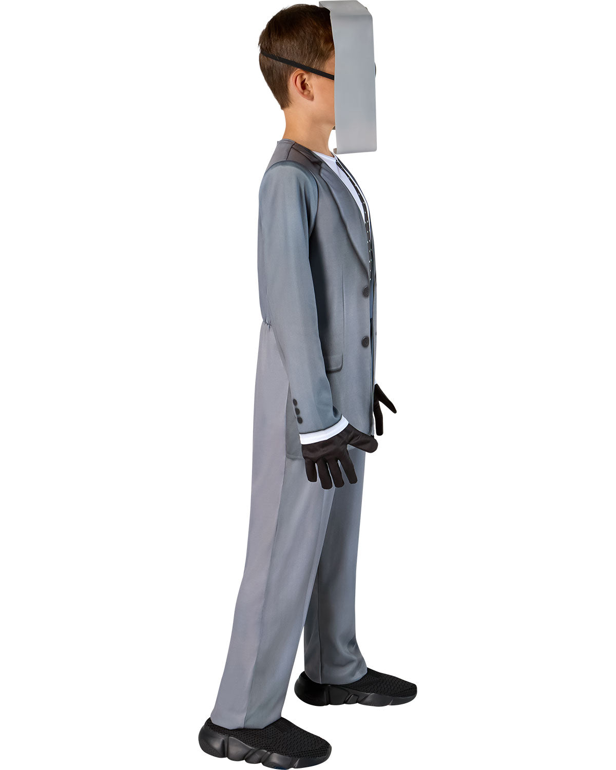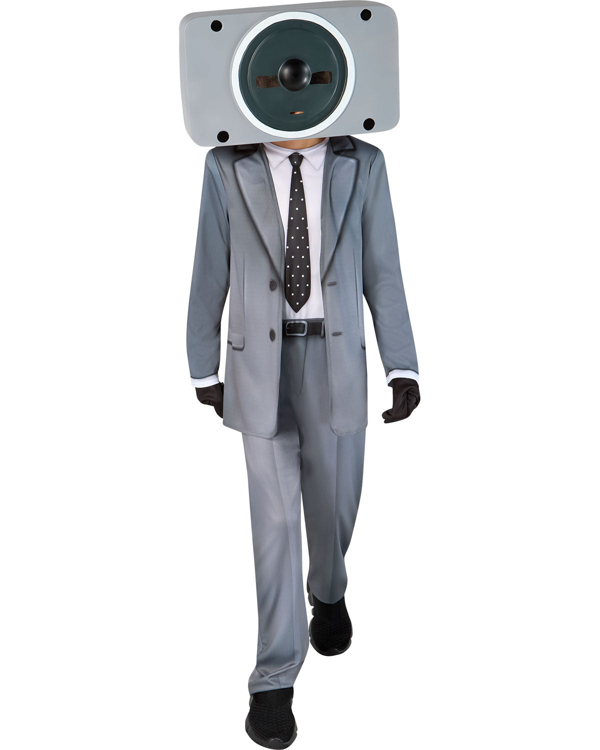 - Includes gray jumpsuit featuring a printed suit, shirt and tie, Speakerman half mask and black gloves