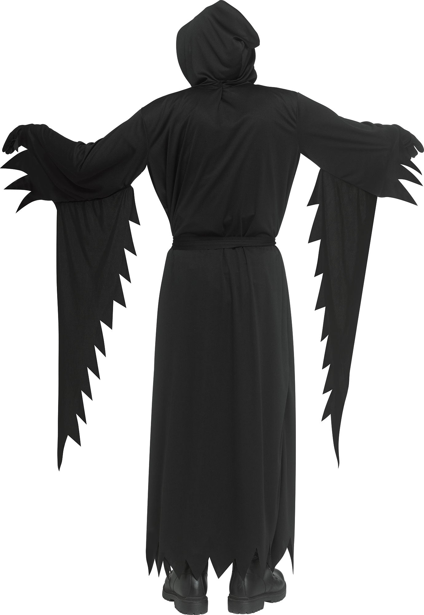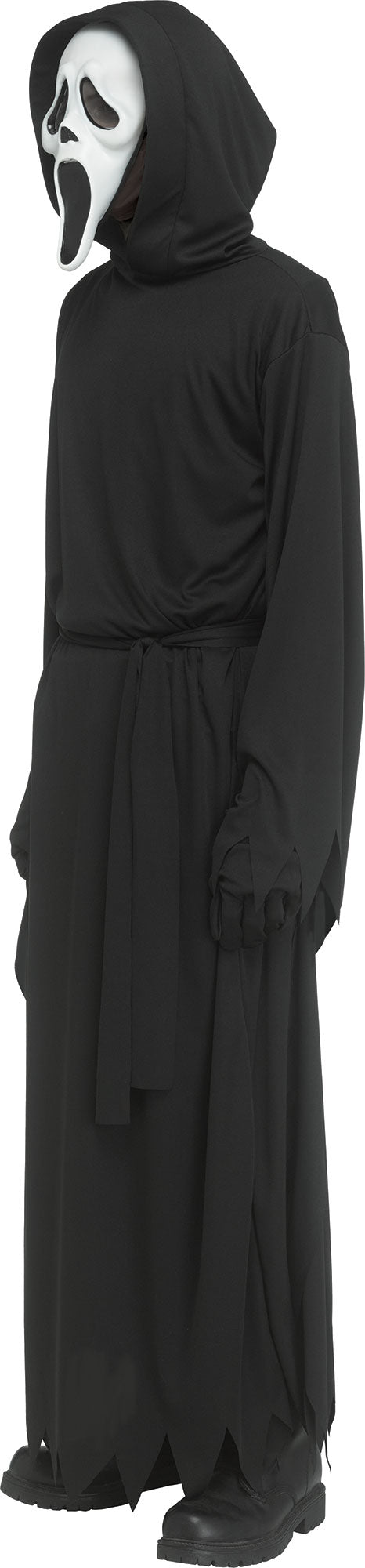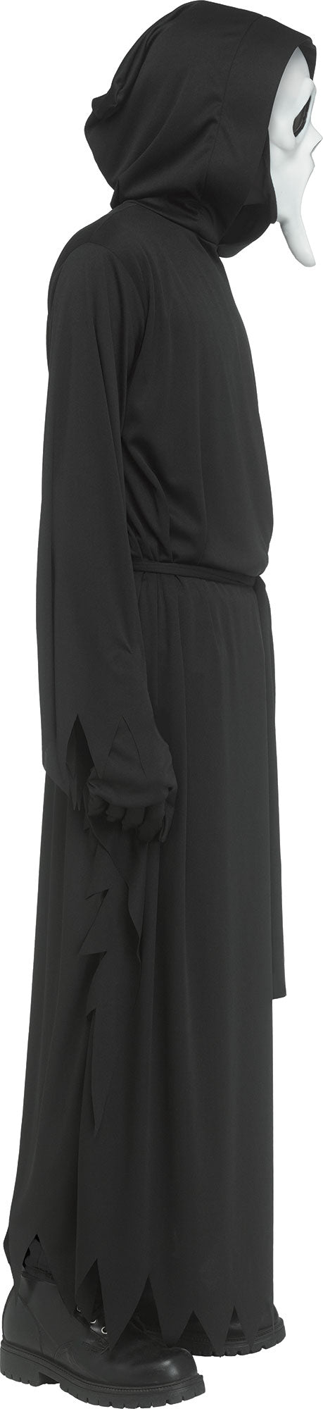 - Features black hooded robe, tie belt, and Ghost Face mask