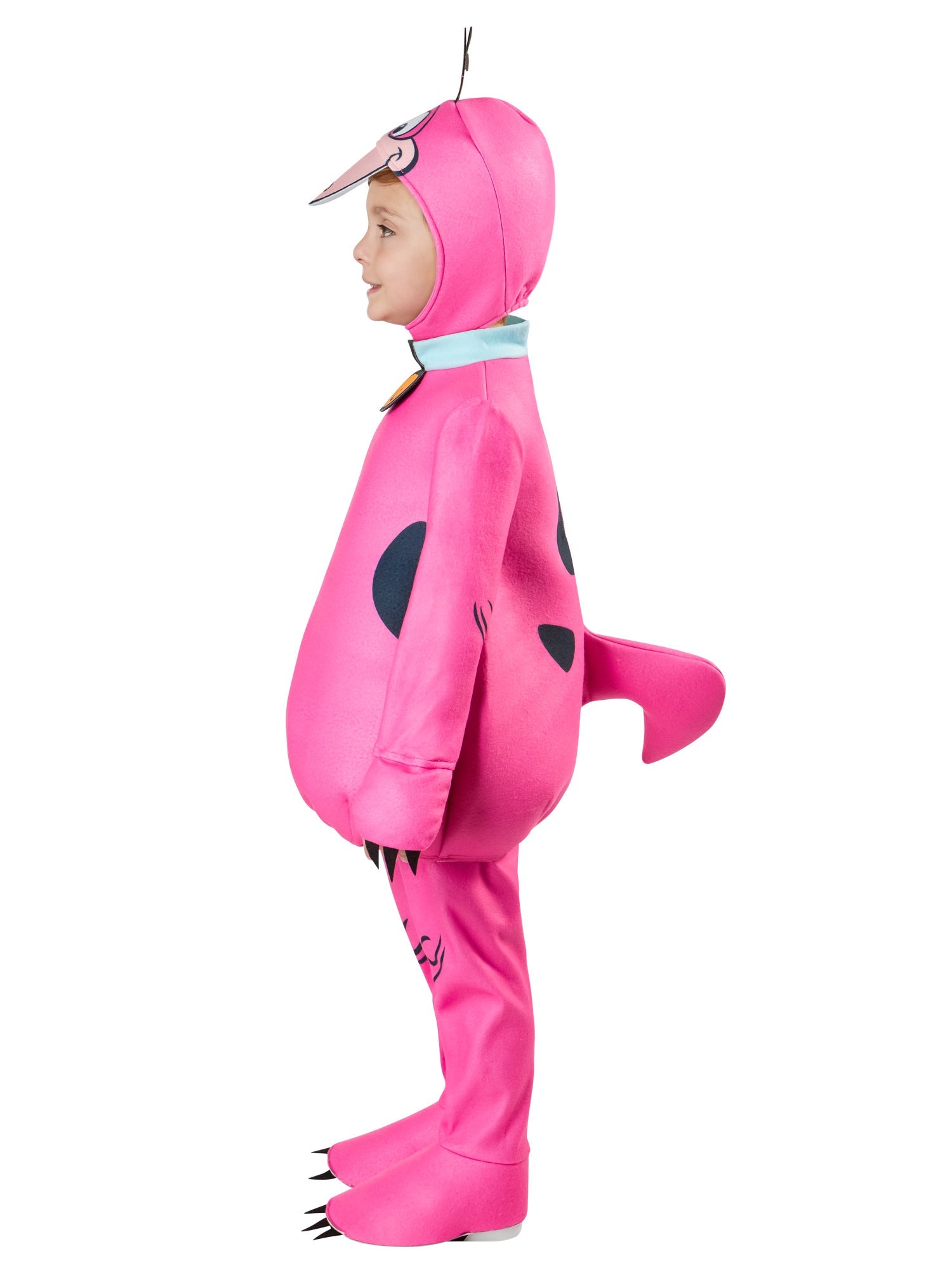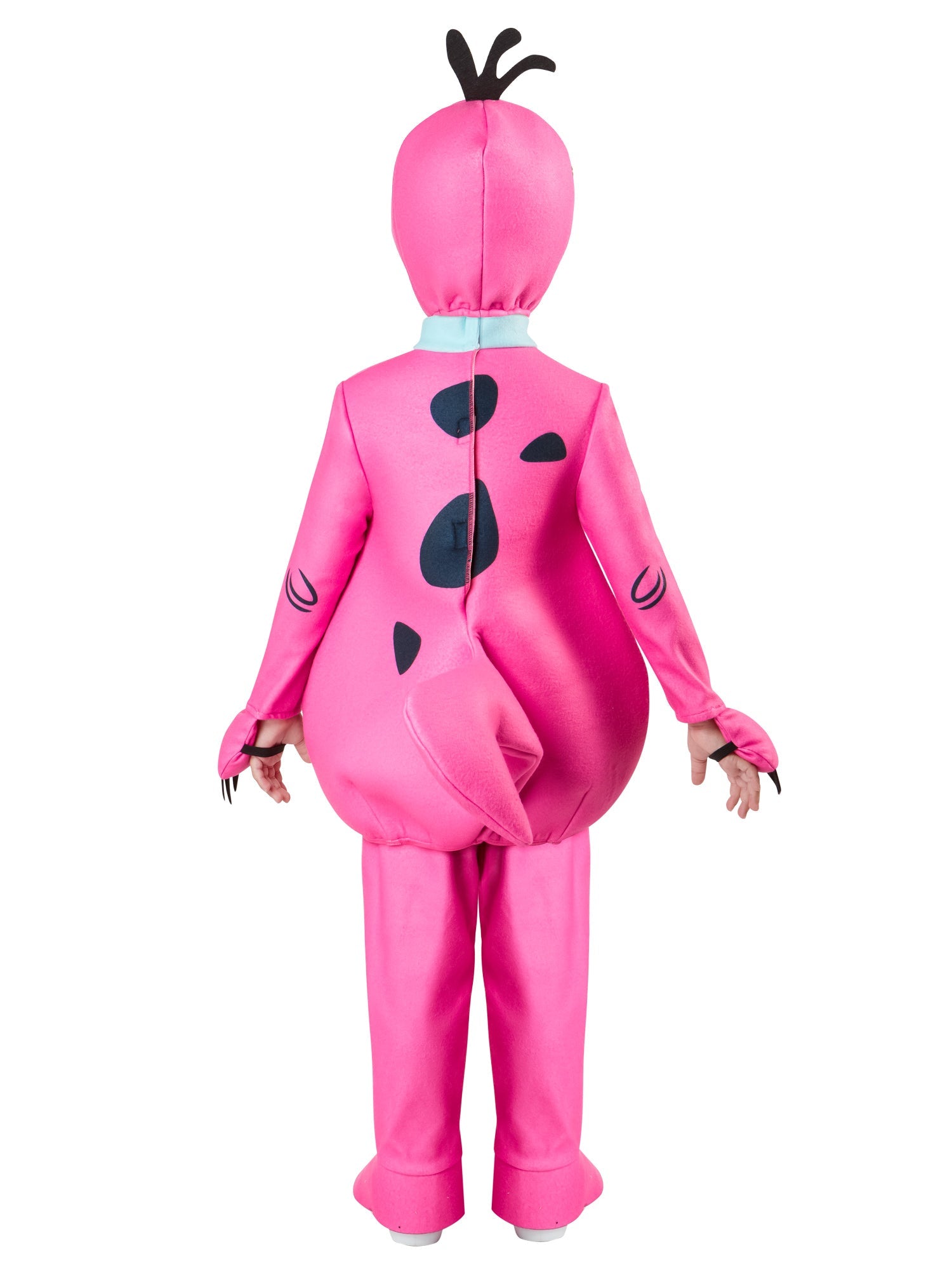 - Includes purple-pink jumpsuit with black spots, attached collar, and attached tail, and Dino's face headpiece